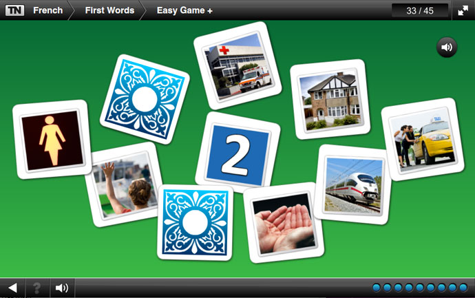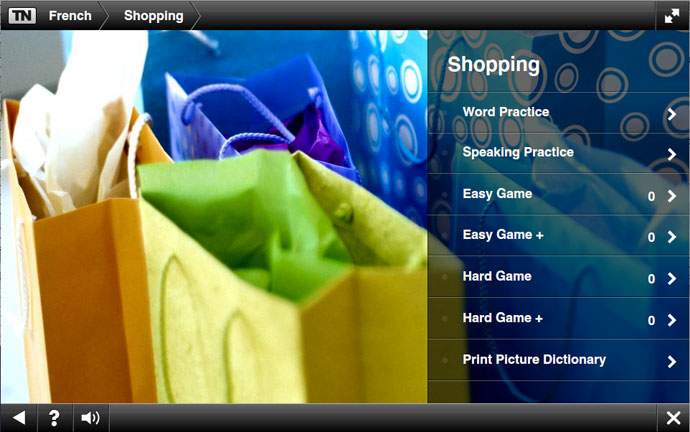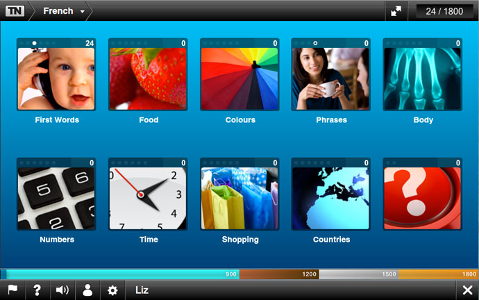 - Nine different topics covering first words, food, colours, phrases, body, numbers, time, shopping and countries.